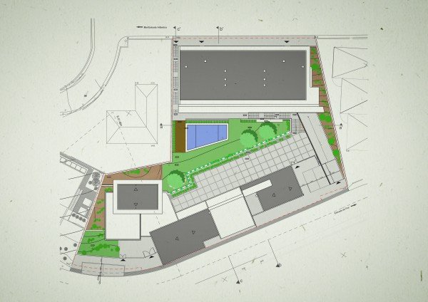 The accesses were located in the Northeast, the West and South via stairs, ramp and direct entry to buildings. The area surrounding the condo would work on two platforms defined by the existing altimetry difference. This determined a small patio at the Rua Francisco Almeida Grandella, and in the a highest point a platform which includes a pool and a garden.